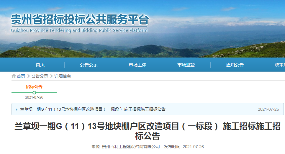 乐居买房讯 7月27日,贵州省招标投标公共服务平台发布兰草坝一期G(11)13号地块棚户区改造项目(一标段)施工招标施工招标公告。
