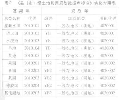 将基期土地利用现状图库转换成土地利用规划过渡图库,必须在保证基期图斑面积和过渡规划图斑面积一致的基础上要遵循以下原则: ① 数据库的内容、存储方式和交换格式符合 《 县(市)级土地利用规划数据库标准 》 的要求; ② 数据质量符合 《 县(市)级土地利用规划管理信息系统建设指南 》 要求; ③ 能够正确导入导出 《 县(市)级土地利用规划数据库标准 》 的数据。下面列举了一部分转化对照表(见表2 )。