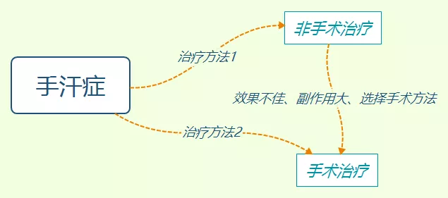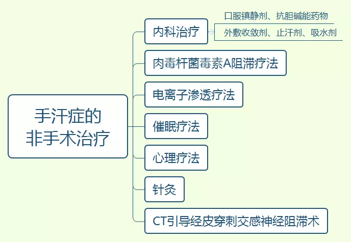 在临床上手汗症的非手术治疗措施主要有内科治疗、肉毒杆菌毒素A阻滞疗法、电离子渗透疗法、催眠疗法、心理疗法、针灸、CT引导经皮穿刺交感神经阻滞术等。其中内科治疗主要包括口服镇静剂、抗胆碱能药物以及外敷收敛剂、止汗剂、吸水剂等。