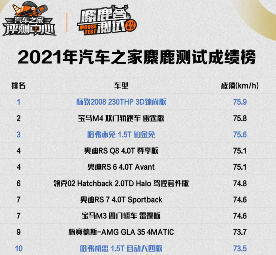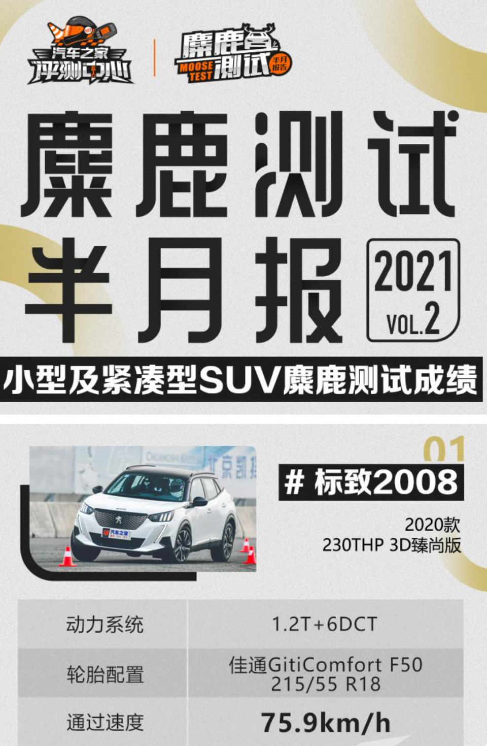 7月23日,汽车之家发布了麋鹿测试半年报中,标致2008以75.9km/h的成绩出现在了第一名的位置。