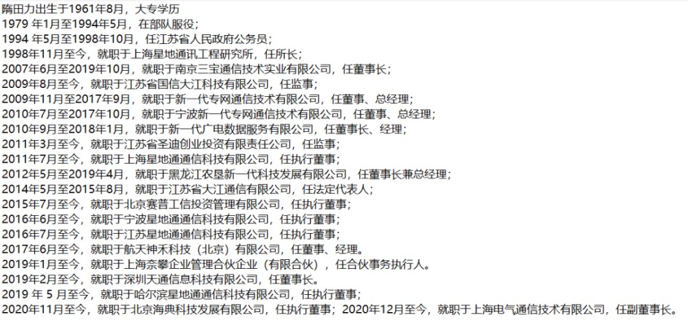 公开资料显示,隋田力为中国电子科技交流中心负责人,在信息通信应用领域经营多年,是新三板公司海高通信的实际控制人。另据查询,他曾于 1979年1月至1994年5月在部队服役;1994年5月至1998年10月,任江苏省政府公务员。1998年之后进入星地通研究所任所长,并成立了多家平台公司。