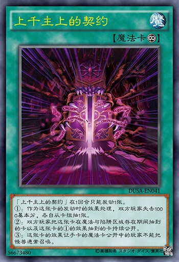 上千主上的契约在1回合只能发动1张。①作为这张卡的发动时的效果处理,双方玩家失去1000基本分,各自从卡组抽1张。②双方玩家把这张卡在魔法与陷阱区域存在期间抽到的卡以及这张卡的①的效果抽到的卡持续公开。③这张卡的效果让手卡的魔法卡公开中的玩家不能把怪兽通常召唤。