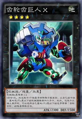Gear Gigant,X的注音是cross。这只怪兽的胸口处装着小齿轮。跟铁皮金鱼一起成为了齿轮的救星。这张卡的检索目标是“齿轮齿轮”,因此也包括“齿轮齿轮人”。