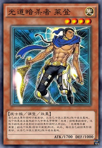 自己的主要阶段时才能发动。从自己卡组上面把2张卡送去墓地。这个效果送去墓地的卡之中有名字带有光道的怪兽的场合,这张卡的攻击力直到对方的结束阶段时上升200。光道暗杀者莱登的这个效果1回合只能使用1次。此外,每次自己的结束阶段发动。从自己卡组上面把2张卡送去墓地。