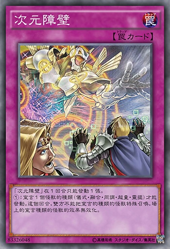 次元障壁在1回合只能发动1张。宣言1个怪兽的种类(仪式·融合·同调·XYZ·灵摆)才能发动。这个回合,双方不能把宣言的种类的怪兽特殊召唤,场上的宣言种类的怪兽的效果无效化。