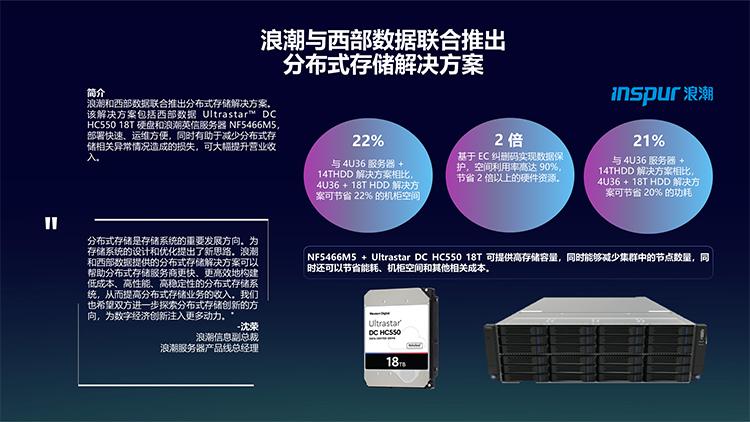 截至目前,西部数据已经成功与众多行业的头部企业开展了合作。例如:浪潮与西部数据联合推出了分布式存储解决方案,该解决方案包括西部数据 Ultrastar DC HC550 18T 硬盘和浪潮英信服务器 NF5466M5,不但具备部署、运维方面的优势,而且有助于减少分布式存储相关异常情况造成的损失,从而大幅提升营收。