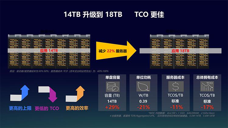 西部数据表示,高容量硬盘可以带来诸多优势,当用户使用的大容量硬盘从 14TB 提高到 18TB 时,容量密度提高 29%,每 TB 功耗就会降低 21%,由此部署成本降低了 11%,总体拥有成本降低了 17%。提高数据中心所使用的硬盘密度同时,大幅度降低了功耗以及总拥有成本。