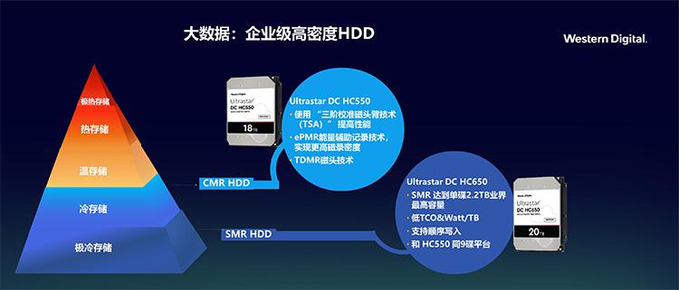针对冷存储、极冷存储的大数据场景,西部数据已经推出了多款产品,20TB Ultrastar DC HC650 主机管理 SMR HDD 和 16TB 与 18TB Ultrastar DC HC550 CMR HDD 已经于 2019 年 9 月发布。Ultrastar DC HC550 搭载 " 三阶校准磁头臂技术(TSA)"、TDMR 磁头技术提高性能,并有 ePMR 能量辅助记录技术实现了更高磁录密度。虽然 Ultrastar DC HC650 和 HC550 同为 9 碟设计,但得益于 SMR 达到了单碟 2.2TB,并支持支持顺序写入,具有低 TCO、Watt/TB 等优势。