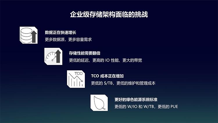 如今,随着数据的爆炸式增长,数据中心面临着诸多挑战,不仅需要更多的存储容量和更高的性能,维护和管理成本也在不断地上升,并产生了能耗问题,传统存储方案很难同时解决这四个方面的痛点。