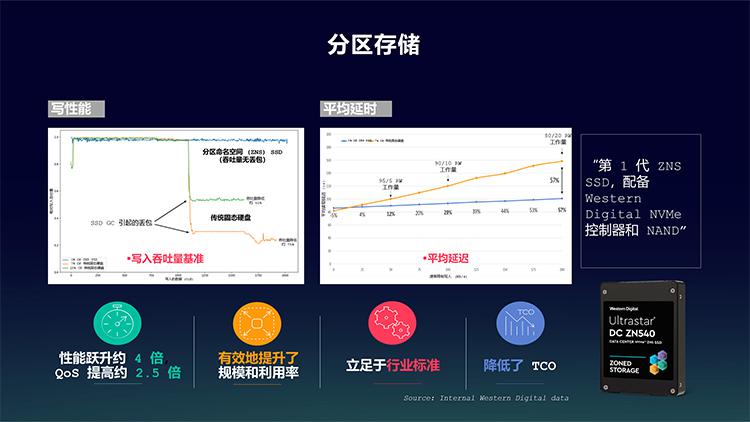 此外,西部数据致力于发展综合分区存储生态系统和应用支持能力,在标准化统一分区存储框架下管理大容量 SMR HDD 和 ZNS SSD 的协同运行。除了支持分区存储计划和 ZoneStorage,为 NVMe 工作组 ZNS 规范和 Linux 开源社区做出贡献,进一步推动生态系统开发之外,西部数据还宣布向部分用户提供新款 Ultrastar DC ZN540 ZNS NVMe SSD 的样品。这款硬盘具有更高的效率、利用率和扩展能力,同时降低了公有云和私有云基础架构的 TCO。