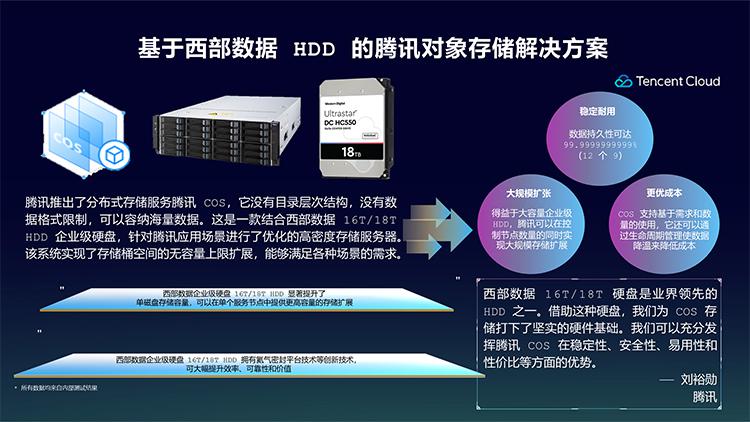 同样,结合西部数据 HDD,目前还推出了腾讯对象存储解决方案,这是一款结合西部数据 16T、18T HDD 企业级硬盘,针对腾讯应用场景进行了优化的高密度存储服务器。据介绍,该系统没有目录层次结构,没有数据格式限制,实现了存储桶空间的无容量上限扩展,能够满足各种场景的需求。