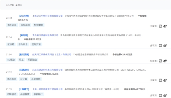 小编利用我们的数据库,给大家汇总了2021年07月27日部分上市公司的中标动态,有些是可能提前触发公告的喔。
