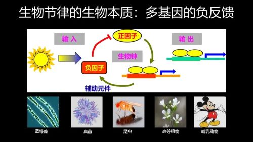 正因子、负因子就是我们所说的生物钟基因,而它也受外界的光和其他信号输入的影响。它也同时控制一系列的基因的表达,来影响我们的生理和行为。我们做了很多个模式生物来研究生物钟,发现“多基因负反馈系统”都是非常正确的,不论是从原核生物到高等动物、植物都是如此。