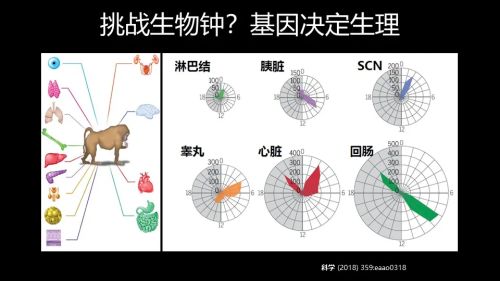 我们知道生物钟节律是写入了我们的基因里头去的,所以也就是说 生物钟它其实是影响非常非常大的,通过生物钟基因,控制了生物钟控制基因来进行表达。我们根据这个结果,来对应我们的各个器官大概最活跃的时间,这个有点像我们中医里的“子午流注”图,当然不是完全的吻合,但至少这个概念是在这里头。