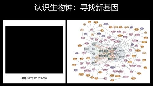 我们可以看到这个圈圈里头,中间的这些是当时已知的生物钟基因,而后来周边的这一些跟它有关联的这一些,都是我们通过全基因组扫描的办法找到的。这个有点像是我们把一个钟表给拆开了,我们可以看到这里头有很多很多个小的零件,而以前我们只是看到钟表的前面,看到时针、分针、秒针,而事实上在生物钟的整体背后,其实有很多个基因进行控制着。