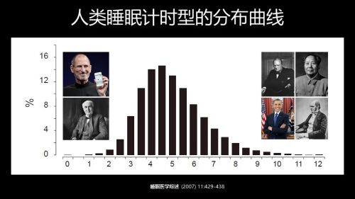 第三个我们说比较明显的感觉到生物钟的情况是什么呢?从行为上来说表现出来的是早睡早起,特别极端的早睡早起,还有很多人都是因为他的生物钟周期变长了,所以他是晚睡晚起的这种情况。我们管早睡早起的人叫做“百灵鸟型”,突出的例子就是像乔布斯和爱迪生,晚睡晚起的典型可能就比较多了,有很多政治家,当然也有我们的生物学的达尔文也是这个样子。