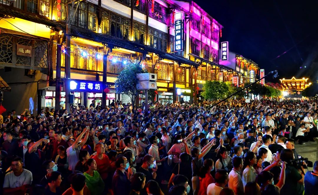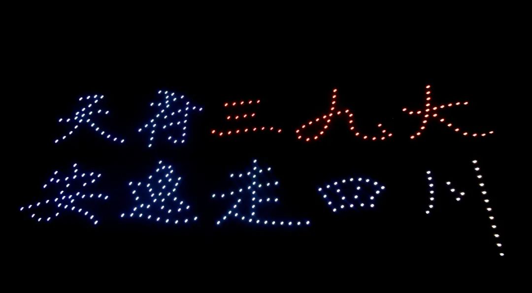 7月27日晚,广元市朝天区曾家镇汉王老街热闹非凡。在汉王老街北牌坊,300架无人机腾空而起。夜幕下,无人机组成“天府三九大·安逸走四川”“美丽朝天欢迎您”等字样以及熊猫、三星堆青铜面具、中子铺细石器等图像。游客们仰望夜空,举着手机记录下这美妙而精彩的过程。