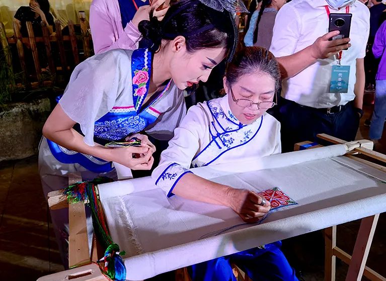 沿着北牌坊行至汉王广场,100位身穿汉服的姑娘行汉礼迎宾。街道旁,绣娘们穿针引线,精美的麻柳刺绣作品让人沉醉于“针尖上艺术”之中。