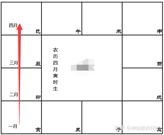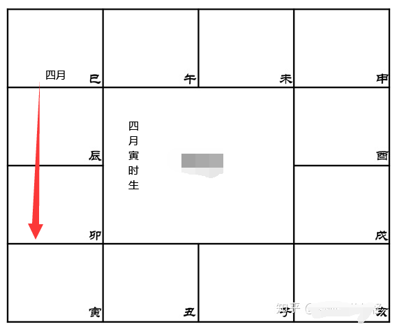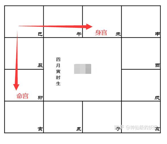 起法是从“寅”开始当做生月一月开始顺时针数。假如是四月十日寅时生,那么从寅为一月开始数到自己的生月,就是寅、卯、辰、巳(四月)。所以巳宫是自己的生月四月。