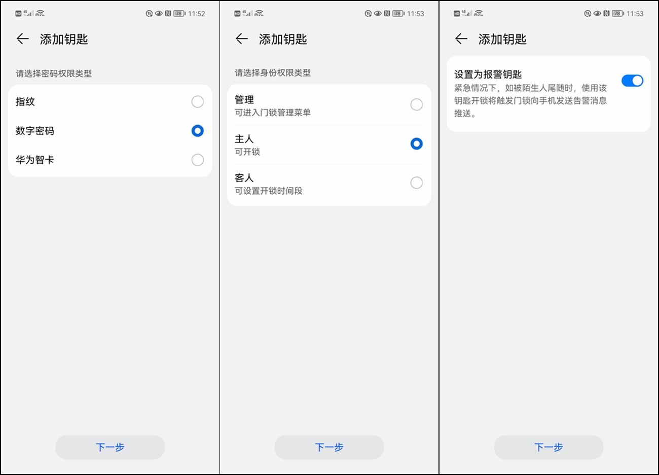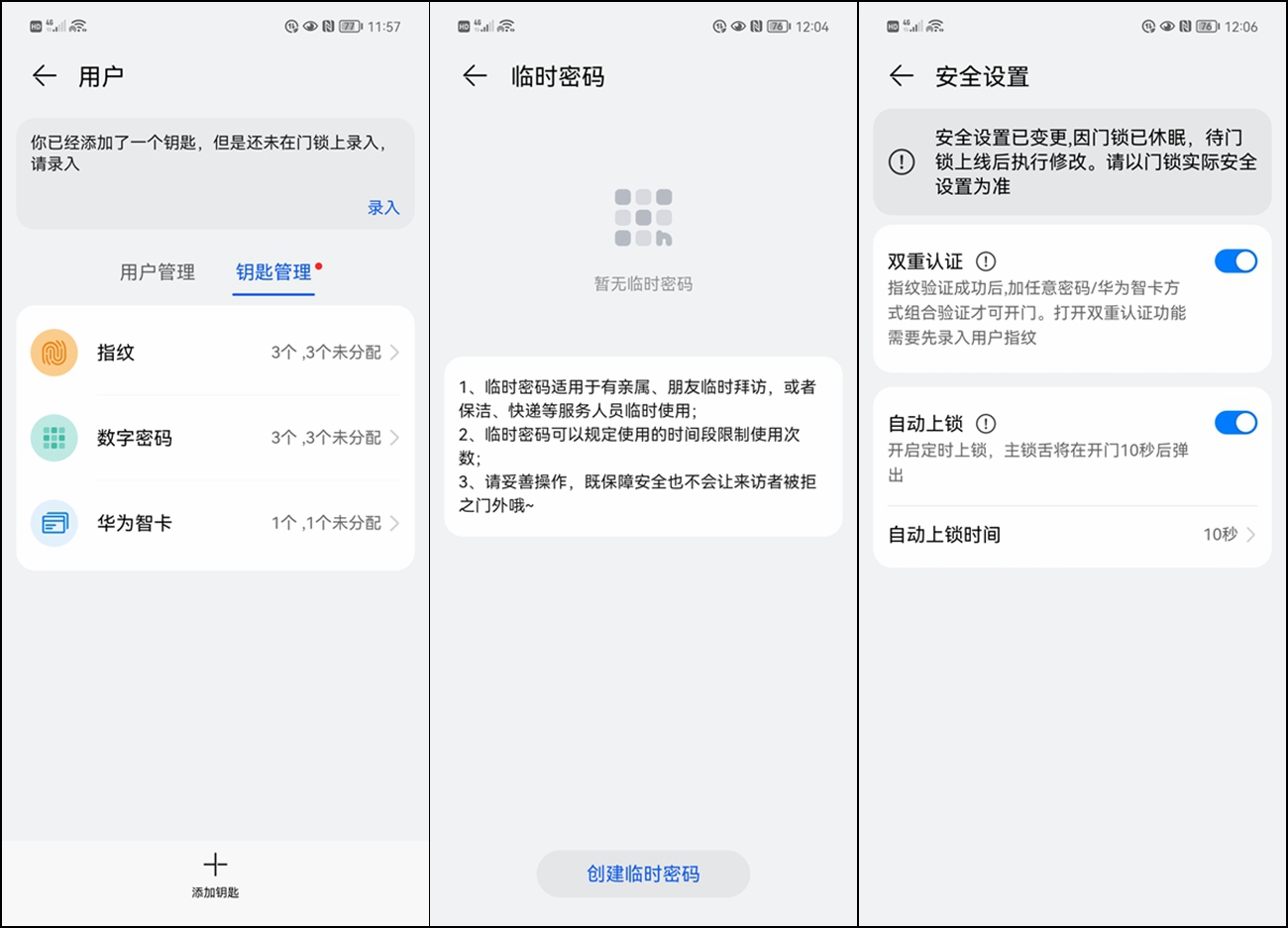 支持用户添加多组的指纹、支持设定临时密码、报警推送消息等功能是如今智能门锁常见的功能,华为智选德施曼智能门锁也都一一具备了,相比之下,它在一些细节之处的设计会更加到位些,比如临时密码可以设定使用的时间段和次数,支持双重认证解锁,以及上文提到的自动上锁等。