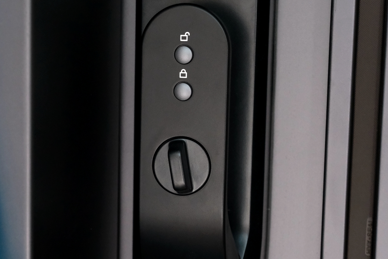 一般情况下,这个应急门把手的使用率并不高,因为通过两个圆形的实体按键来实现门的自动解锁和反锁会更加轻松。键帽不算很大,但是点按起来手感还是不错的,而且也就两个按键,旁边有对应标识,所以很好区分。
