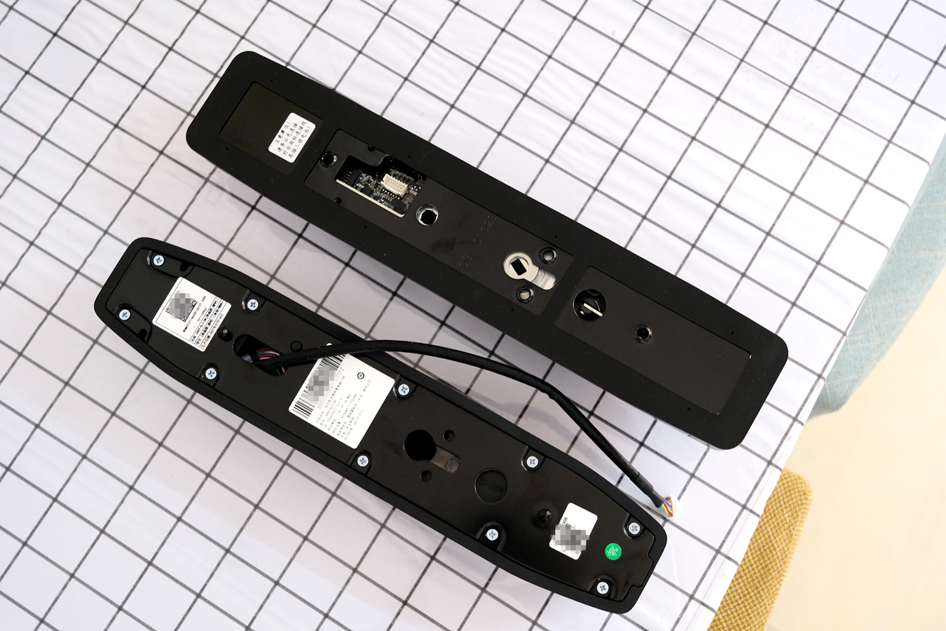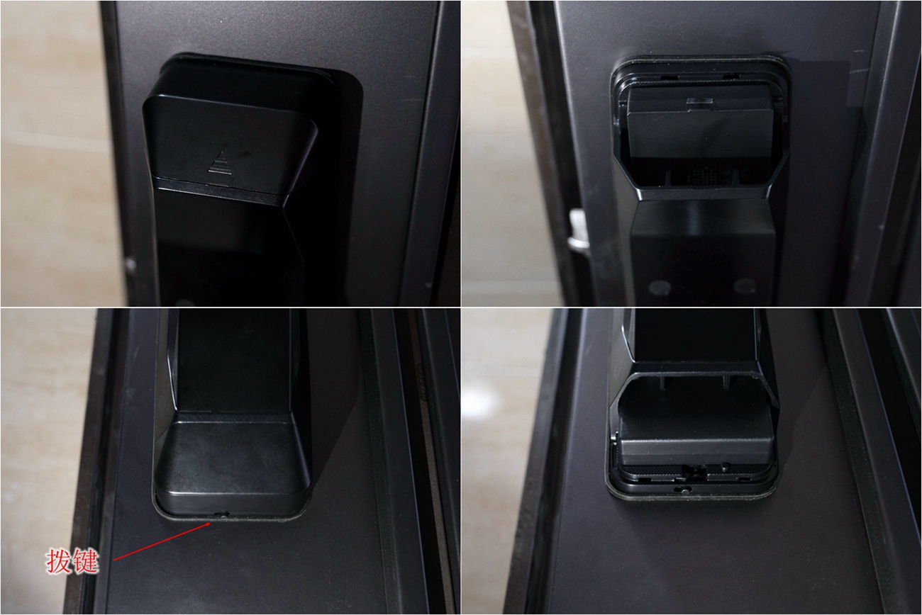 在室内锁具的上侧与下方分辨是两块锂电池的安装位置,两块锂电池大小不一样,大的安装在上侧,小的安装在下方,打开盖子就可以看到电池仓了,安装很容易。