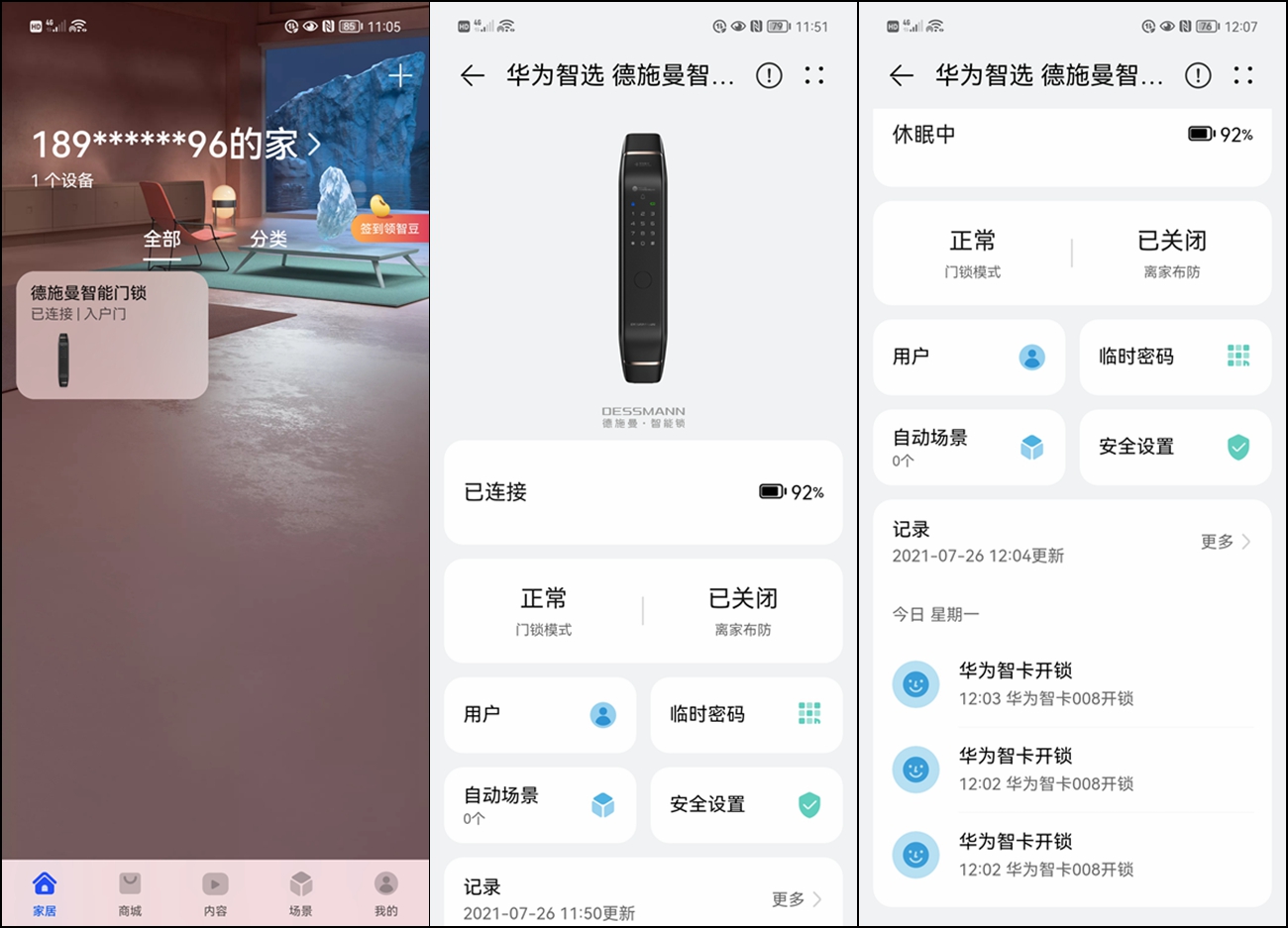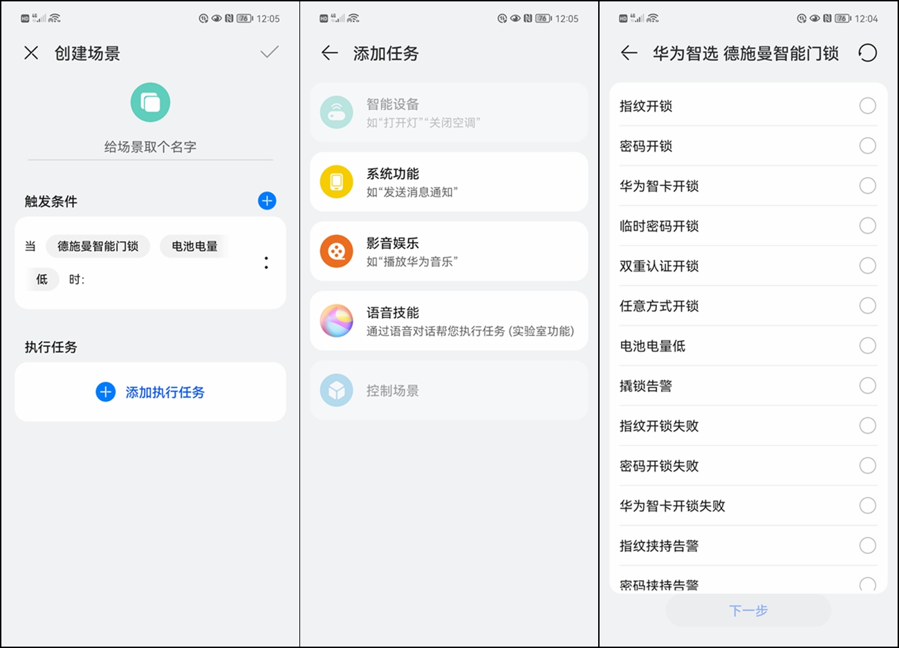 在笔者看来,支持智能家居联动才是华为智选德施曼智能门锁更大的卖点,用户通过设置触发条件和执行任务,就可以实现智能家居的自动化操作,比如设置回家模式,一开门家里的灯就会自动亮起,窗帘缓缓合上,蓝牙音箱也自动播放音乐等;又不如设置离家模式,轻点一键上锁键之后,家里的空调、电灯、蓝牙音箱等设备缓缓关闭,告别出门反复确认电器是否关闭问题,一键解决你的健忘症。同时安防系统如摄像头、红外人体感应器、烟雾报警器等开启工作。笔者目前的房子还没彻底装修好,等装修好之后,肯定会买一些智能家居产品来体验一下这项功能。