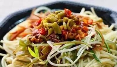 4)海带、黄瓜、大头咸菜切细丝,绿豆芽洗净过 沸水焯烫,酸豆角切成末。