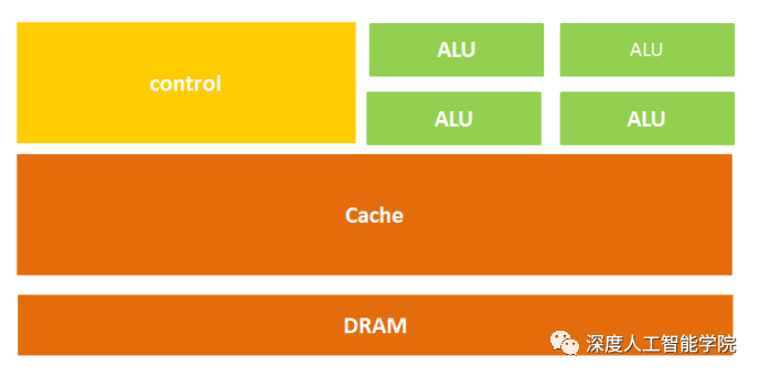 因为CPU的架构中需要大量的空间去放置存储单元(橙色部分)和控制单元(黄色部分),相比之下计算单元(绿色部分)只占据了很小的一部分,所以它在大规模并行计算能力上极受限制,而更擅长于逻辑控制。
