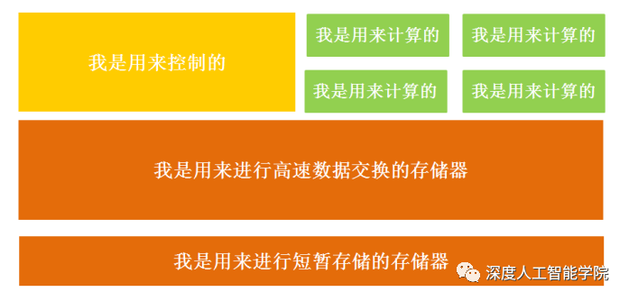 这个过程看起来是不是有点儿复杂?没关系,这张图可以不用记住,我们只需要知道,CPU遵循的是冯诺依曼架构,其核心就是:存储计算程序,按照顺序执行。讲到这里,有没有看出问题,没错——在上面的这个结构图中,负责计算的绿色区域占的面积似乎太小了,而橙色区域的缓存Cache和黄色区域的控制单元占据了大量空间。高中化学有句老生常谈的话叫:结构决定性质,放在这里也非常适用。