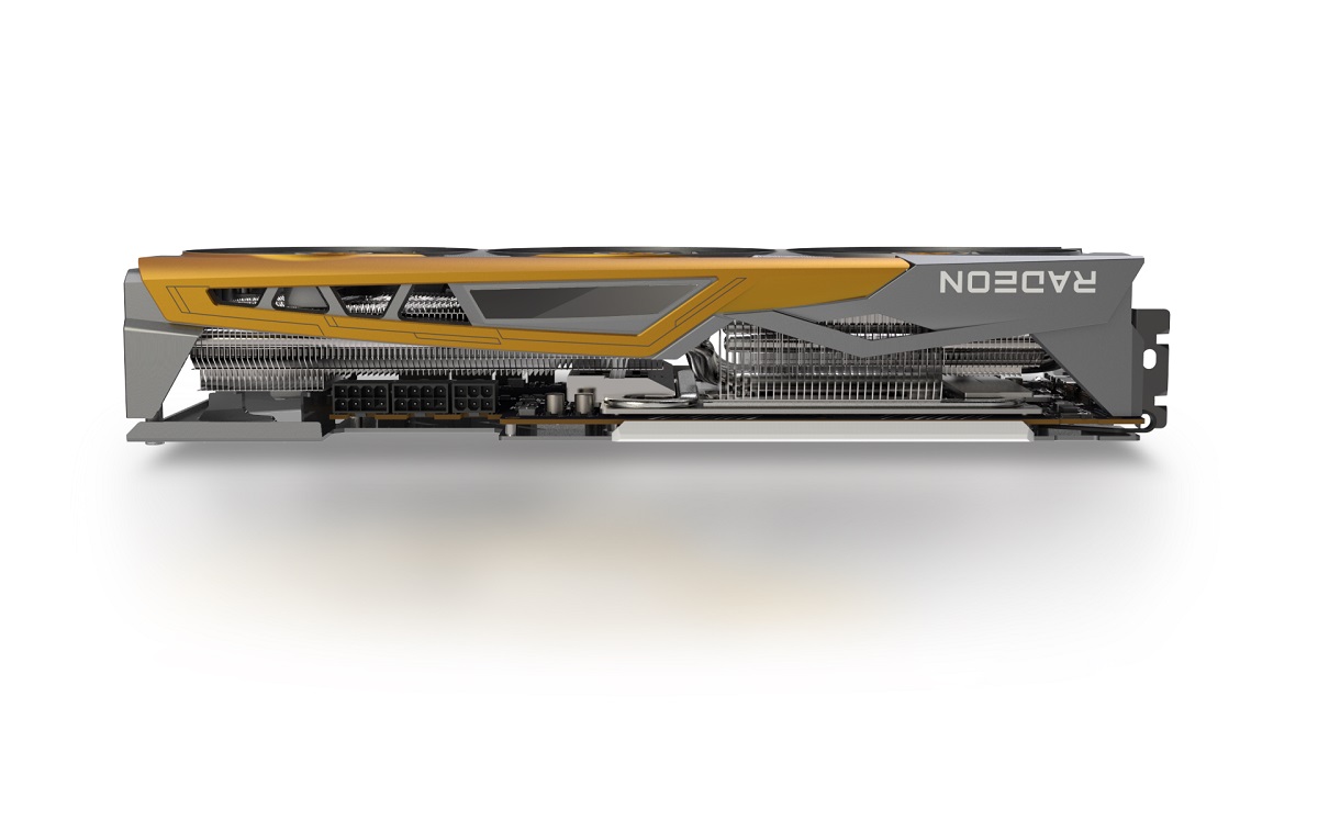 这款名为Toxic AMD Radeon RX 6900 XT Air Cooled的产品使用的也是特挑的Navi 21 XTXH核心,采用了金色搭配银色的配色,延续了此前Toxic系列的设计风格,整体尺寸为320 x 134.85 x 58.4 mm。其采用了定制的PCB板设计,配备了三风扇的散热系统,以及两个8Pin和一个6Pin外接电源接口。