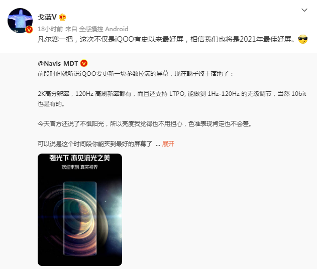 而iQOO产品经理@戈蓝V 也毫不掩饰自己对新旗舰屏幕的夸赞,他表示新机的屏幕不仅是iQOO有史以来的最好屏幕,也将是2021年最佳好屏。
