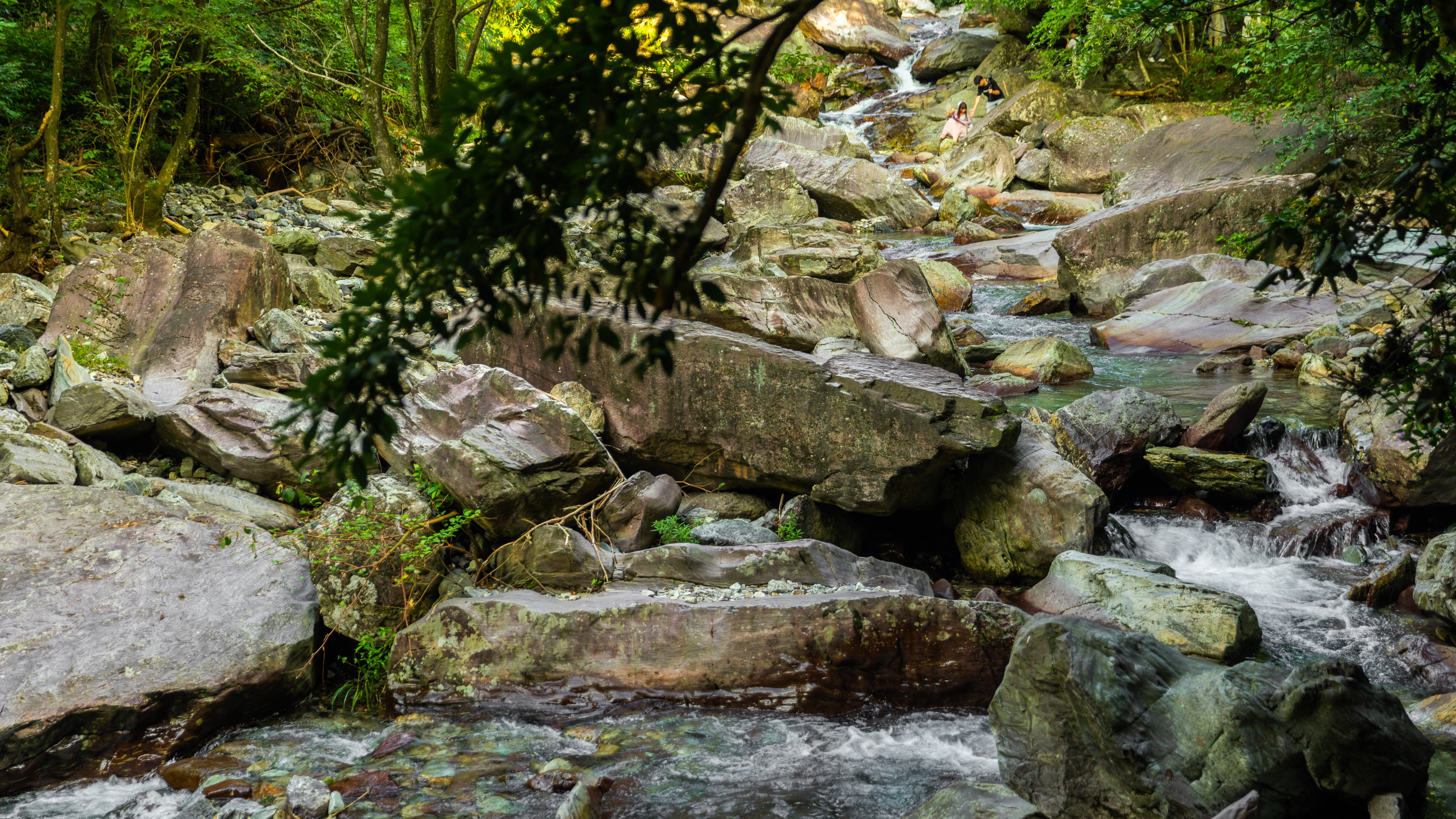 整个河床像一条玉带,河床上散落着天然形成的,各种五彩斑斓,千姿百态的玉石。夏日里远离了都市的喧嚣,来到七彩玉谷,仿佛置身人间仙境。