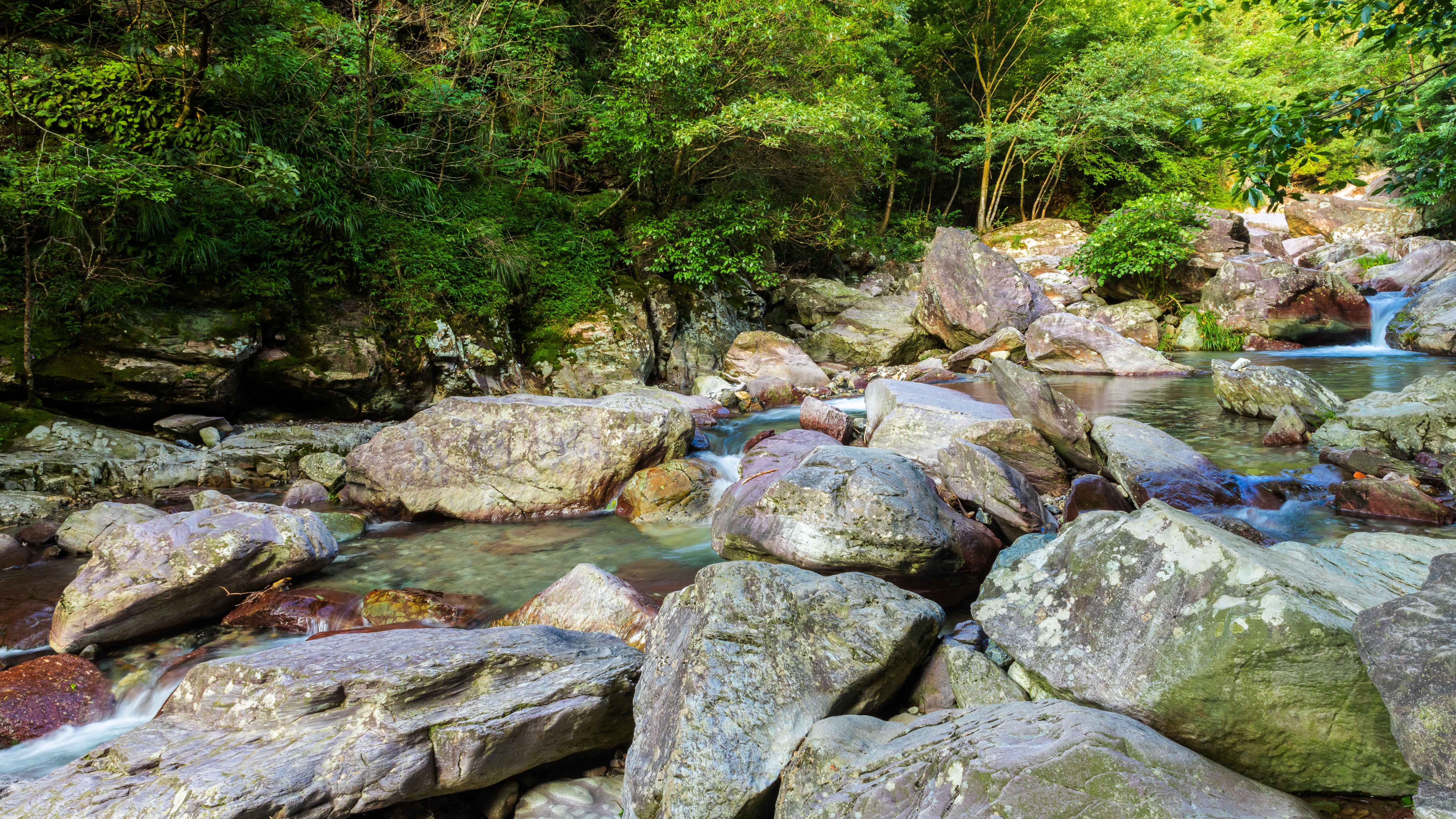 走进其间,峡谷幽深,川流不息的泉水从玉石中流过,一路有碧潭无数,透过潭水,彩色的石纹清晰可辨。