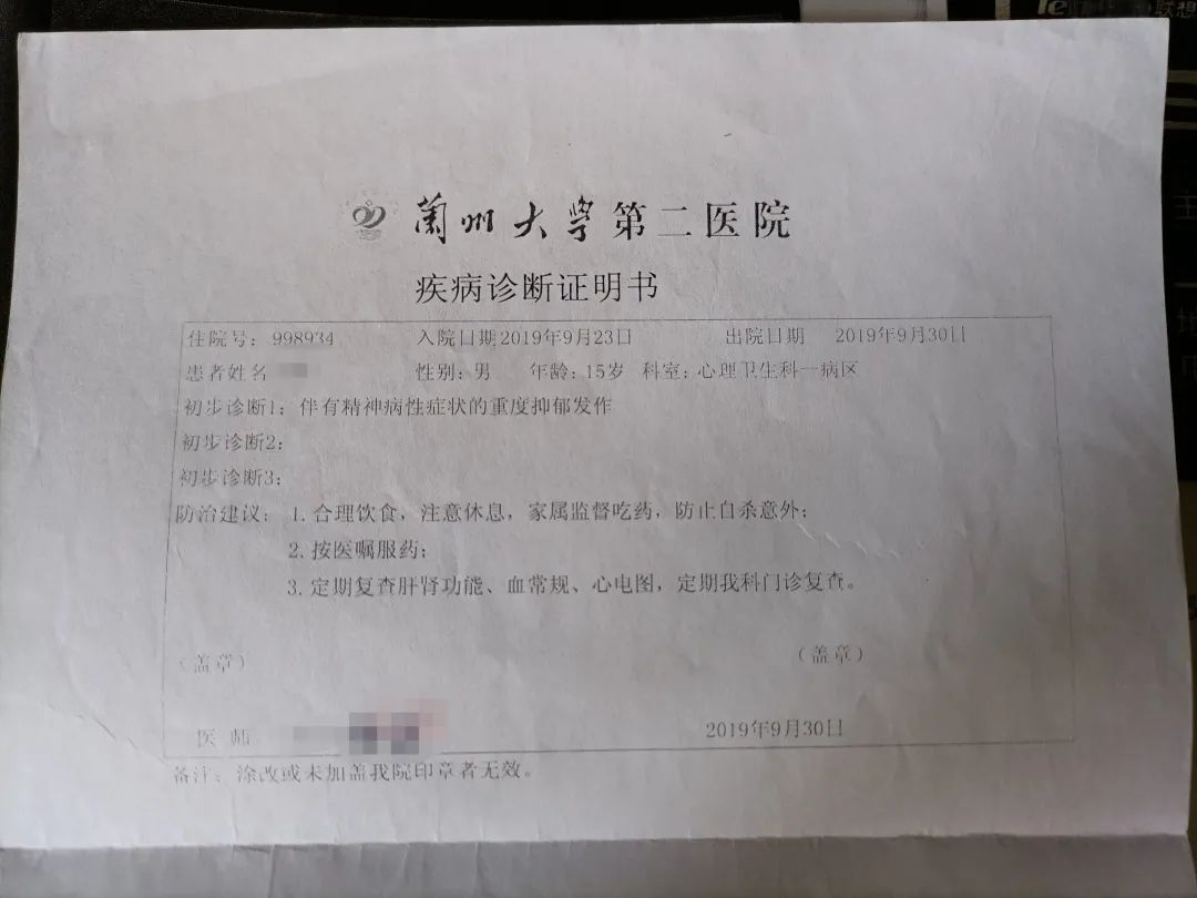 9 月份时,李雪被诊断为「伴精神病性症状的重度抑郁发作」,出现幻觉,他怀疑自己被跟踪,有自杀想法。