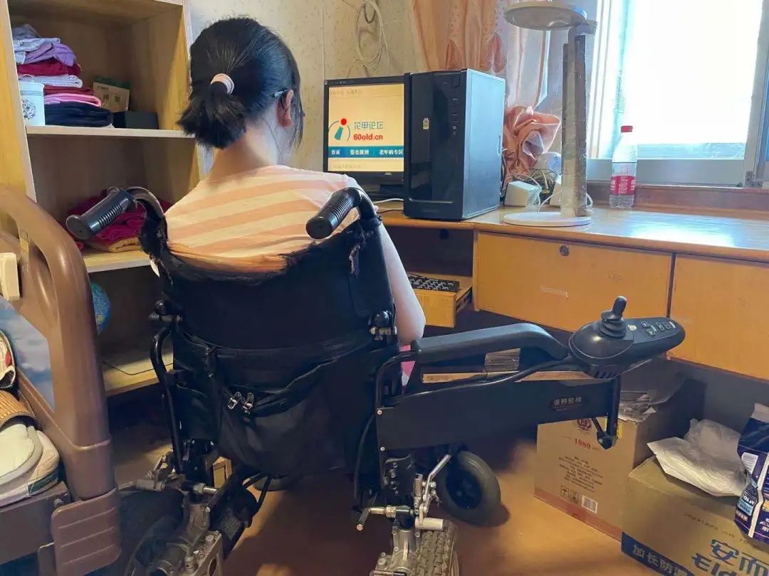 王磊坐在轮椅上,头向前倾斜,桌上的黑色机箱挡住了侧脸。王磊的父亲拿起鼠标和鼠标垫,放在她右臂垂下后手指停留的大腿处。向前十厘米是键盘,王磊用指头滚动滑轮,调出300%的放大镜,再把手指挪到键盘上。