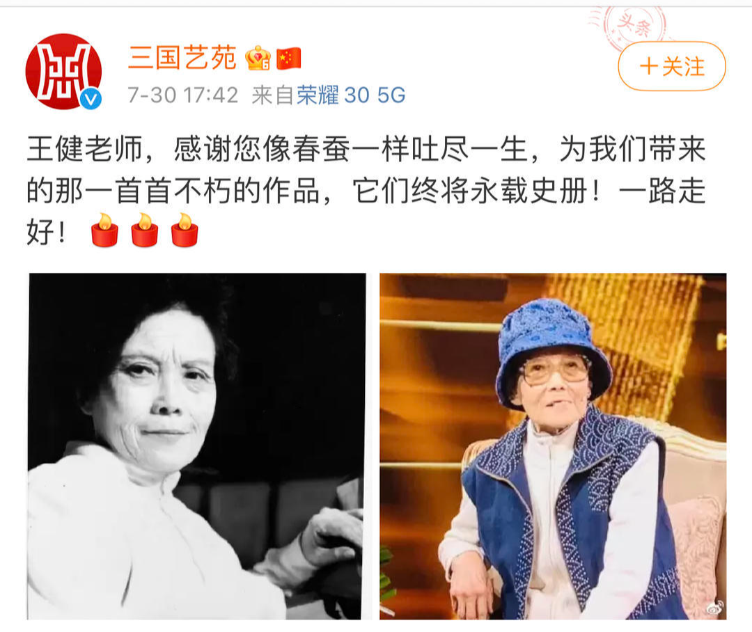 继歌手巫慧敏去世后不久,据“三国艺苑”官方账号发文透露,曾与谷建芬老师合作多次,《歌声与微笑》的词作者、曾为电视剧《三国演义》创作十余首插曲的著名词作家、中国音乐家协会会员王健老师7月30日因病去世,享年93岁。值得一提的是,《歌声与微笑》是由王健作词,谷建芬作曲,上海小荧星儿童合唱团演唱的一首歌曲,发行于1986年。当时,这首歌的领唱小童星正是刚因癌症去世的歌手巫慧敏。