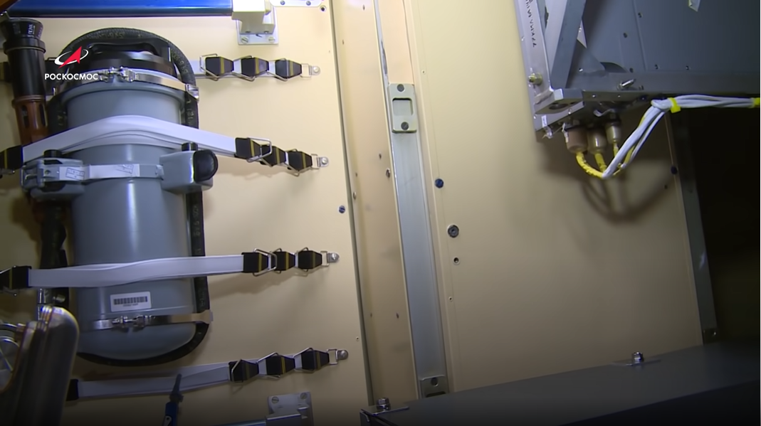 在实验舱舱门开启后,宇航员将一个管道放入舱段内,完成空气的净化,取得了空气样本。视频中可见,该实验舱内部装有大量实验设备,空间比较狭小。
