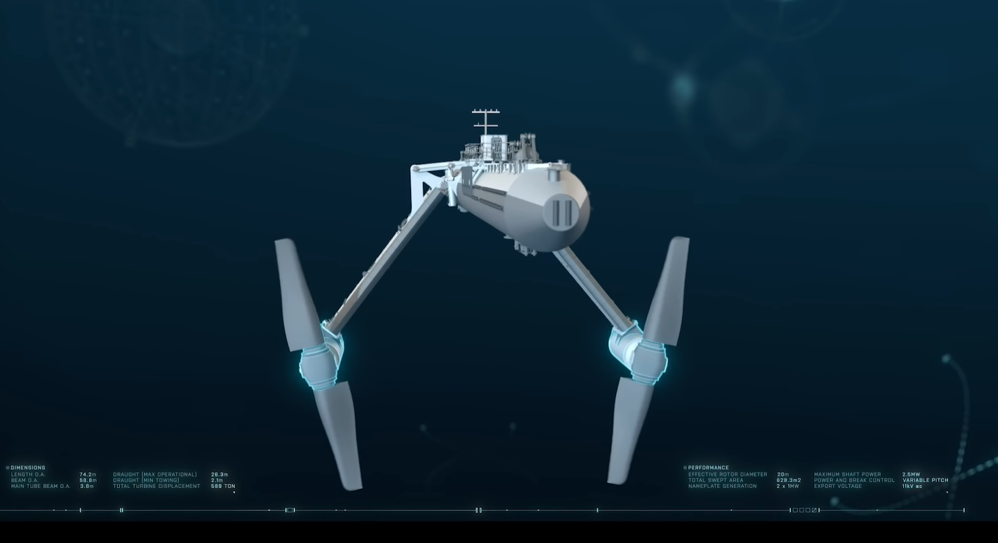 从视频中可见,这一发电机的两个桨叶能够同步上下抬升,以适应不同的潮汐条件。发电机的桨叶为双叶片造型,角度可旋转。