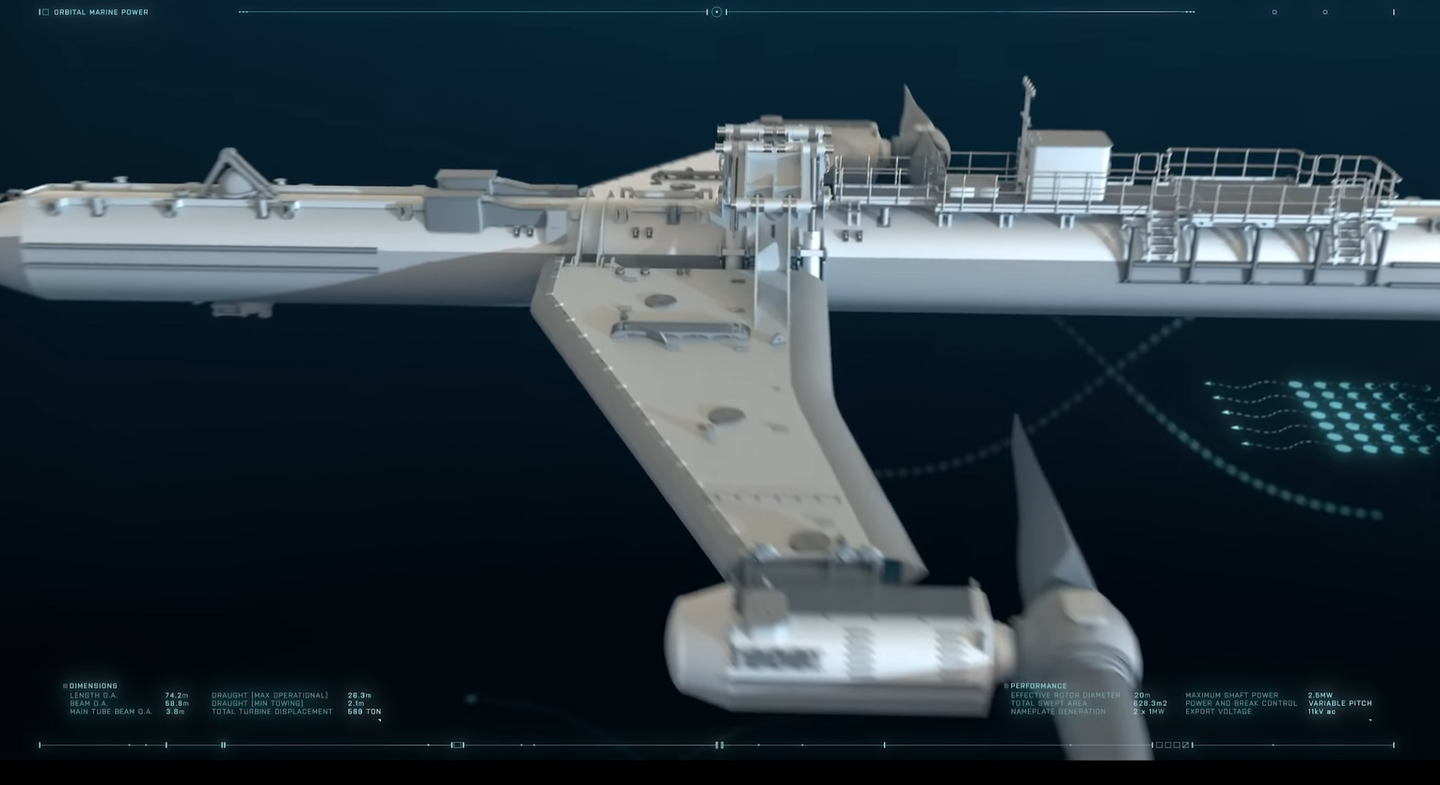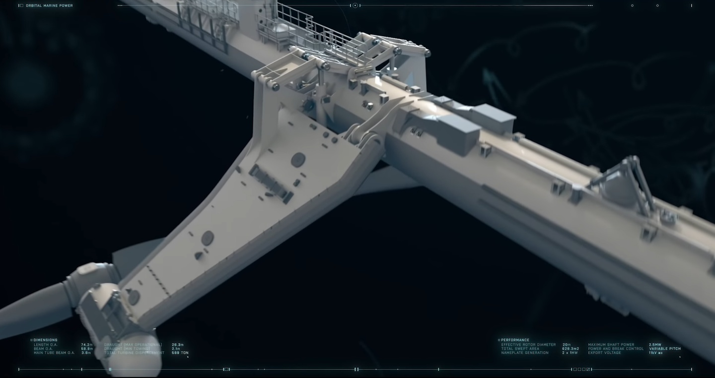 Orbital O2 发电机本体为长圆柱造型,长 74 米,重 680 吨,使用钢缆固定在海面。该发电机于今年 4 月 23 日被驳船运送至目标海域,其最大功率可达 2 兆瓦,能够同时满足 2000 个英国家庭的用电需求,每年可减排 2200 吨二氧化碳。