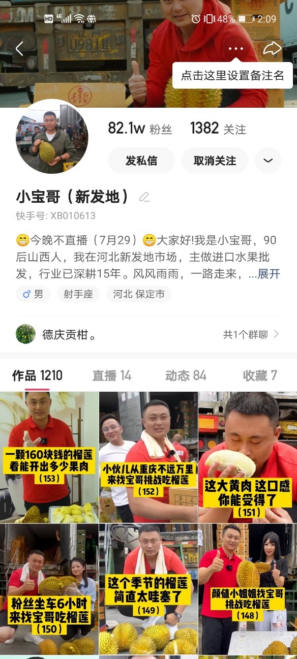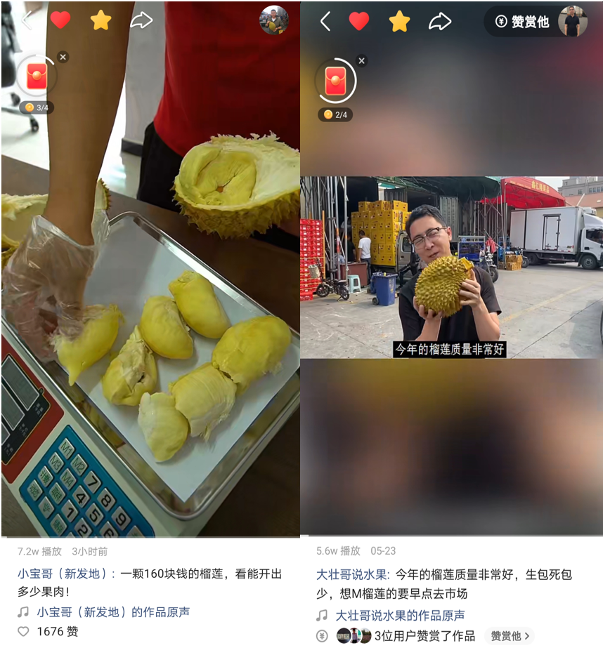 也正是因为他们的专业知识丰富又不失轻松趣味的短视频作品,和对产品、服务品质的精益求精,让以榴莲为代表的水果的鲜美味道从果园产地直抵无数吃货们的舌尖,也使得他们在不到一年时间里涨粉数十万,成长为快手水果批发垂类主播中的新生力量。