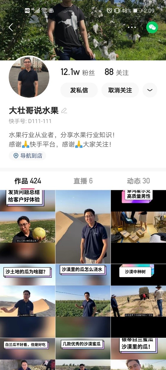 “相当于我们从一个传统的水果商变成半自媒体水果商的身份,把水果行业最欠缺的营销环节这块短板补了一些,通过快手,我们联系到很多合作方,促成了双方的交易。”大壮哥介绍道,“目前粉丝还不算太多,但每一波卖五六百、七八百单还是可以的。”