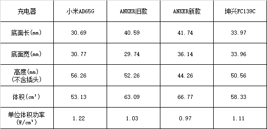 本来没有打算写这部分的,用卡尺随手卡了一下几个充电头的尺寸,发现数据有点反直觉,厂家通过平衡产品的底面积和长度来实现视觉上的大小控制,也算是工业设计上的巧思,顺便算一下现在比较流行的“每体积功率,W/cm³”值的大小,为保证数据可信,把测试图片也贴上来,体积和 W/cm³ 值汇总成表格,供大家自行判断取舍。
