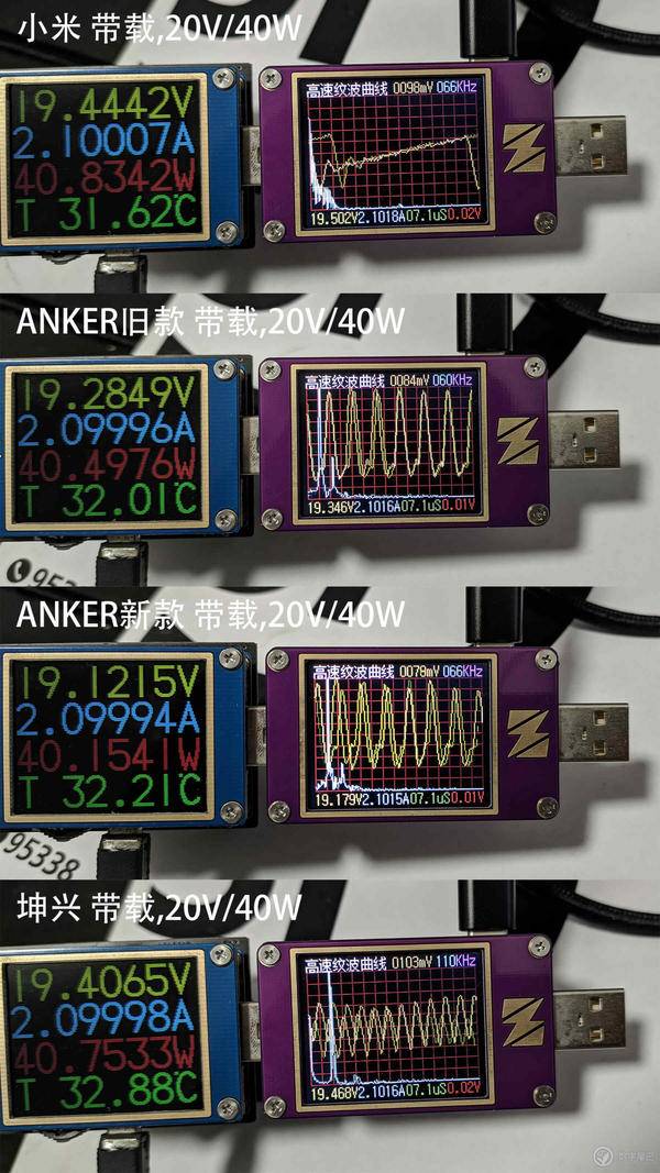带载纹波是体现真正实力的环节,通过负载调节到 20V/40W 输出进行测试,可以看出带载纹波的表现基本上跟发布时间和价格是有相关性的,最贵最新的 Anker 新款带载纹波表现最好,其次是去年夏秋发布的 Anker 旧款,再次则是去年春天发布的小米 AD65G,垫底的是最便宜的坤兴 FC139C,简单地说就是,要么拼高科技要么拼高成本…