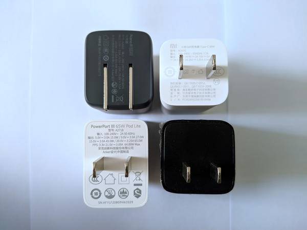 从较宽的一侧看,Anker 新款似乎没比旧款短多少,不过其收纳式插头设计也占了一部分体积,和小米 AD65G 相比,还是短了不少,我更倾向于短一点的机身,对墙插的兼容性更好一些;Anker 旧款在这四个充电器里应该是最胖的,但有了新款的方形身材衬托,似乎…感觉还行?