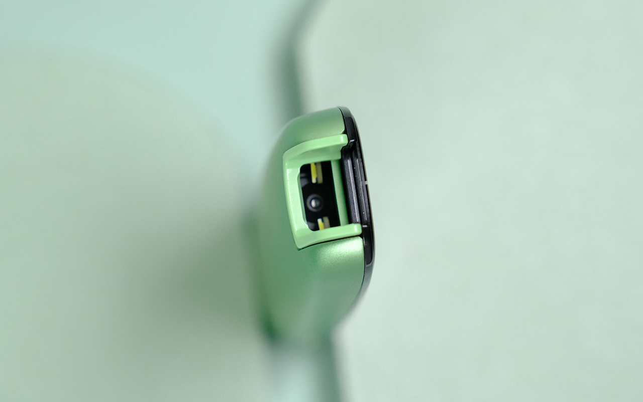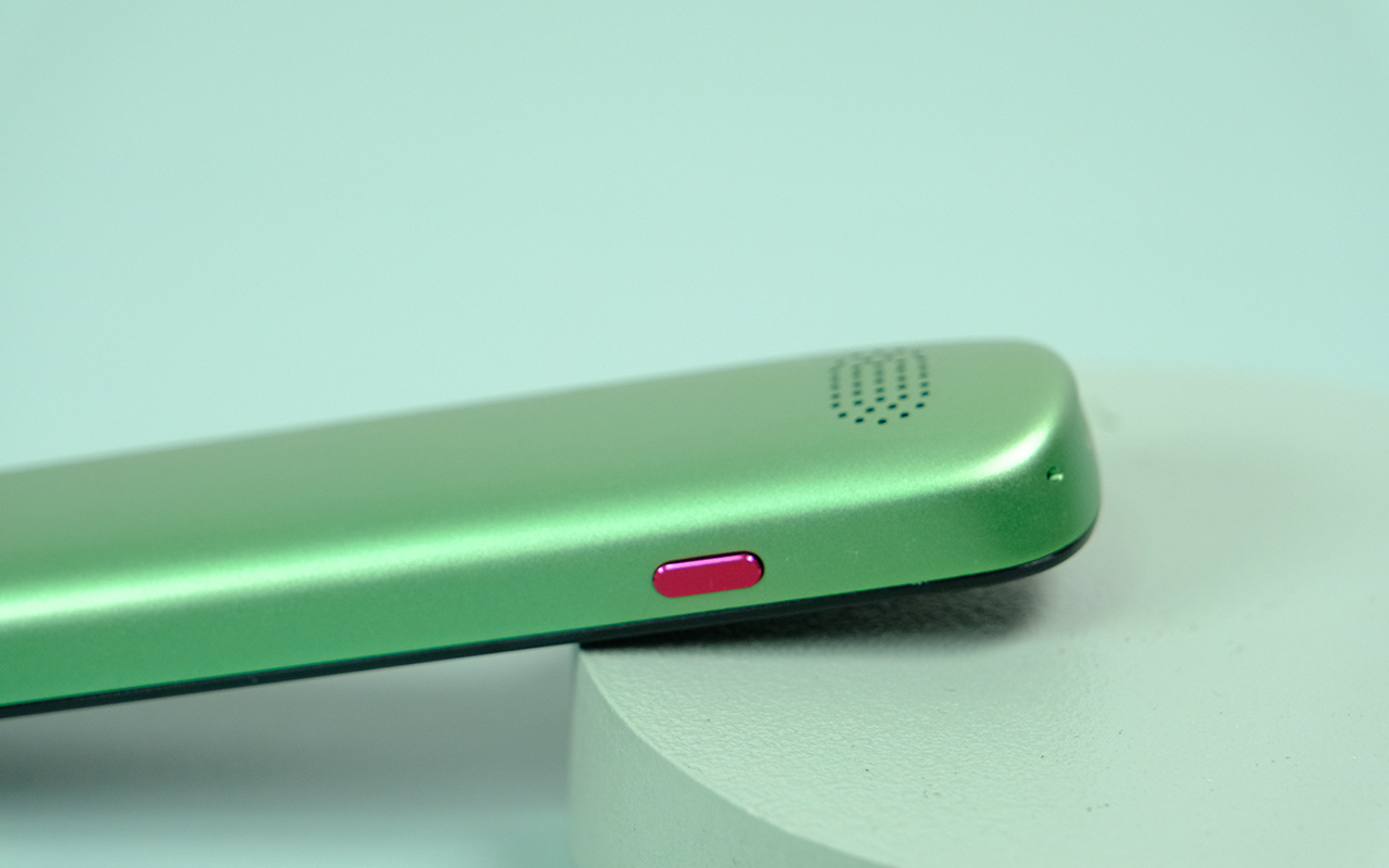 按键和接口方面,机身左侧为电源键、右侧为语音键;底部为Type-C充电口,两侧则是两个麦克风。机身背部是AAC高保真扬声器,搭配了自研麦克风阵列降噪技术。