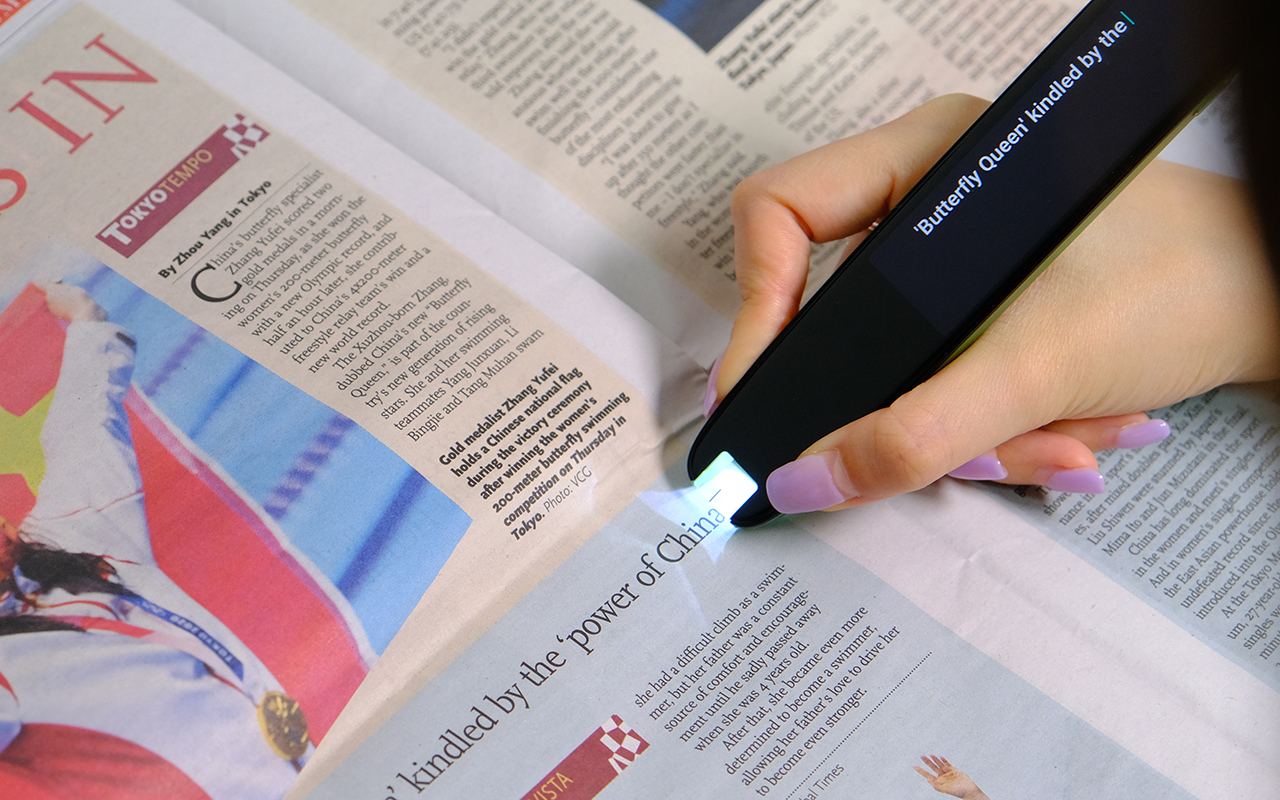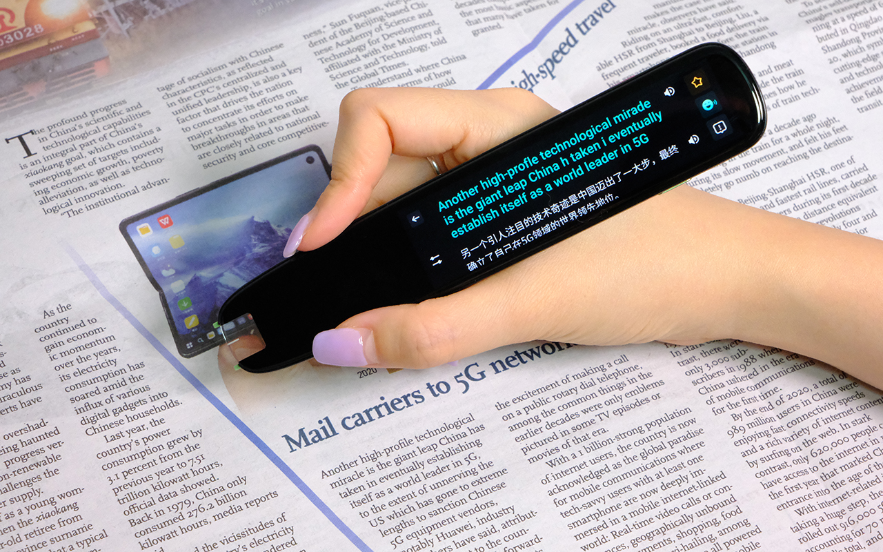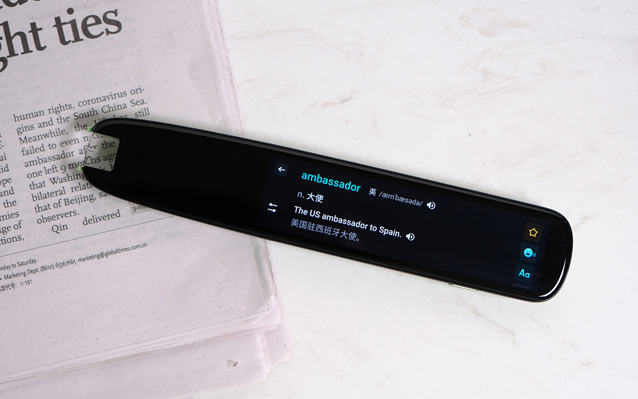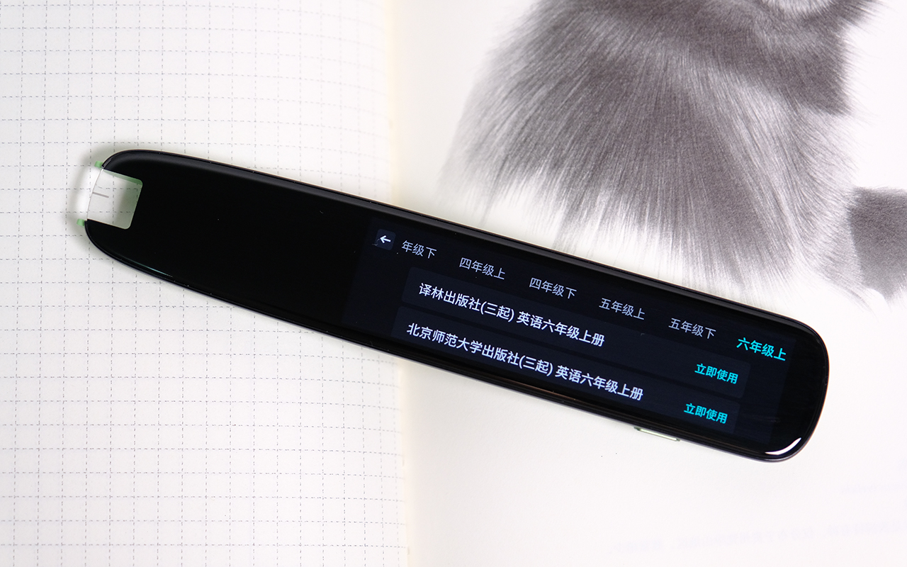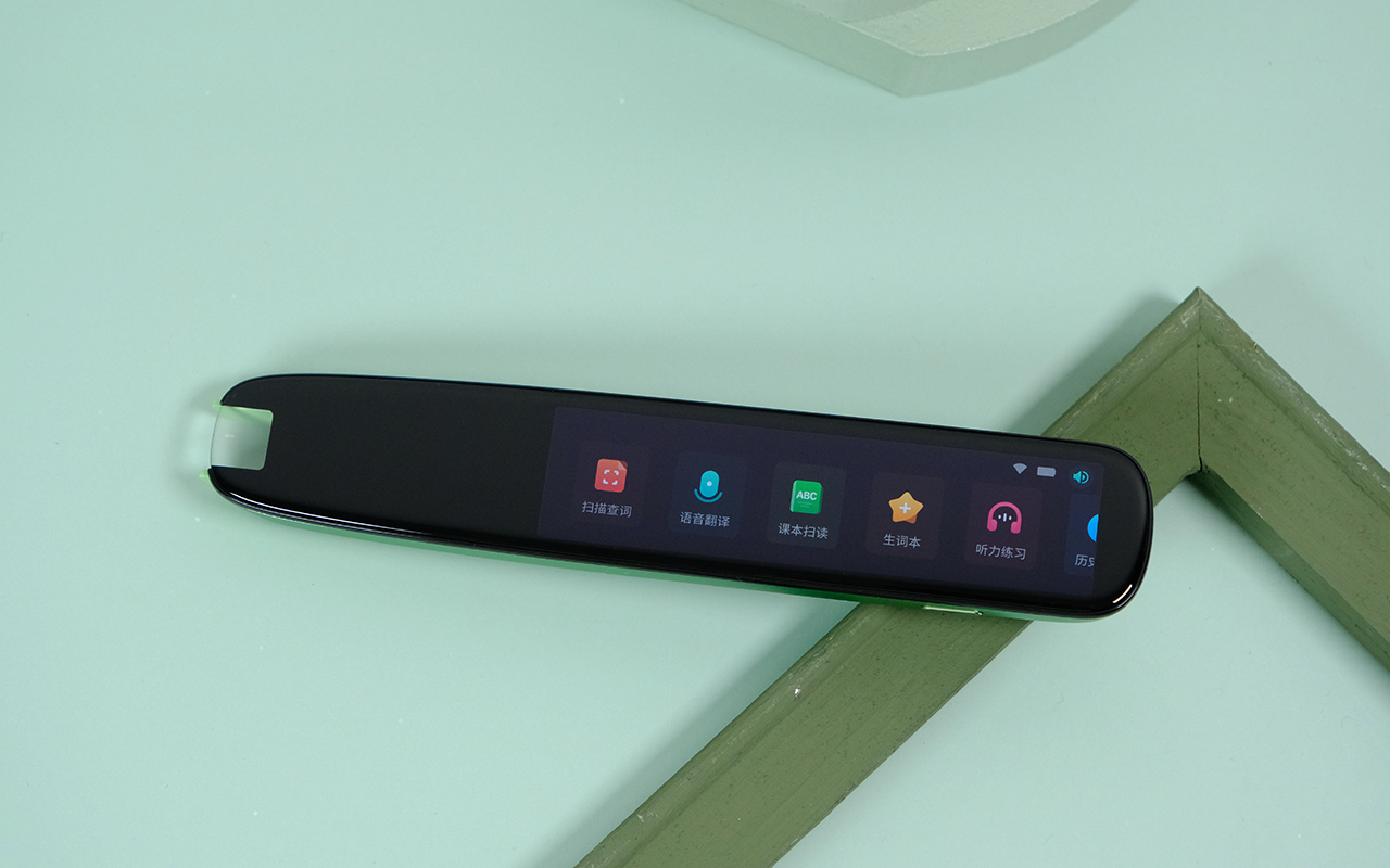 当我们进行扫描时,笔头的闪光灯会亮起,代表着翻译笔开启扫描,扫描结束后闪光灯则会关闭,只要扫描角度在70-90度之间,均可以进行精准扫描。得益于折行扫描功能的加持,再长的语句也可以一次扫描完成,甚至可以完成段落的扫描,极大提升了学习效率。扫描完成后,大屏上会对内容进行自动翻译以及语音播报。值得一提的是,语音播报的声音十分自然,可以帮助学生得到更好的口语练习环境。