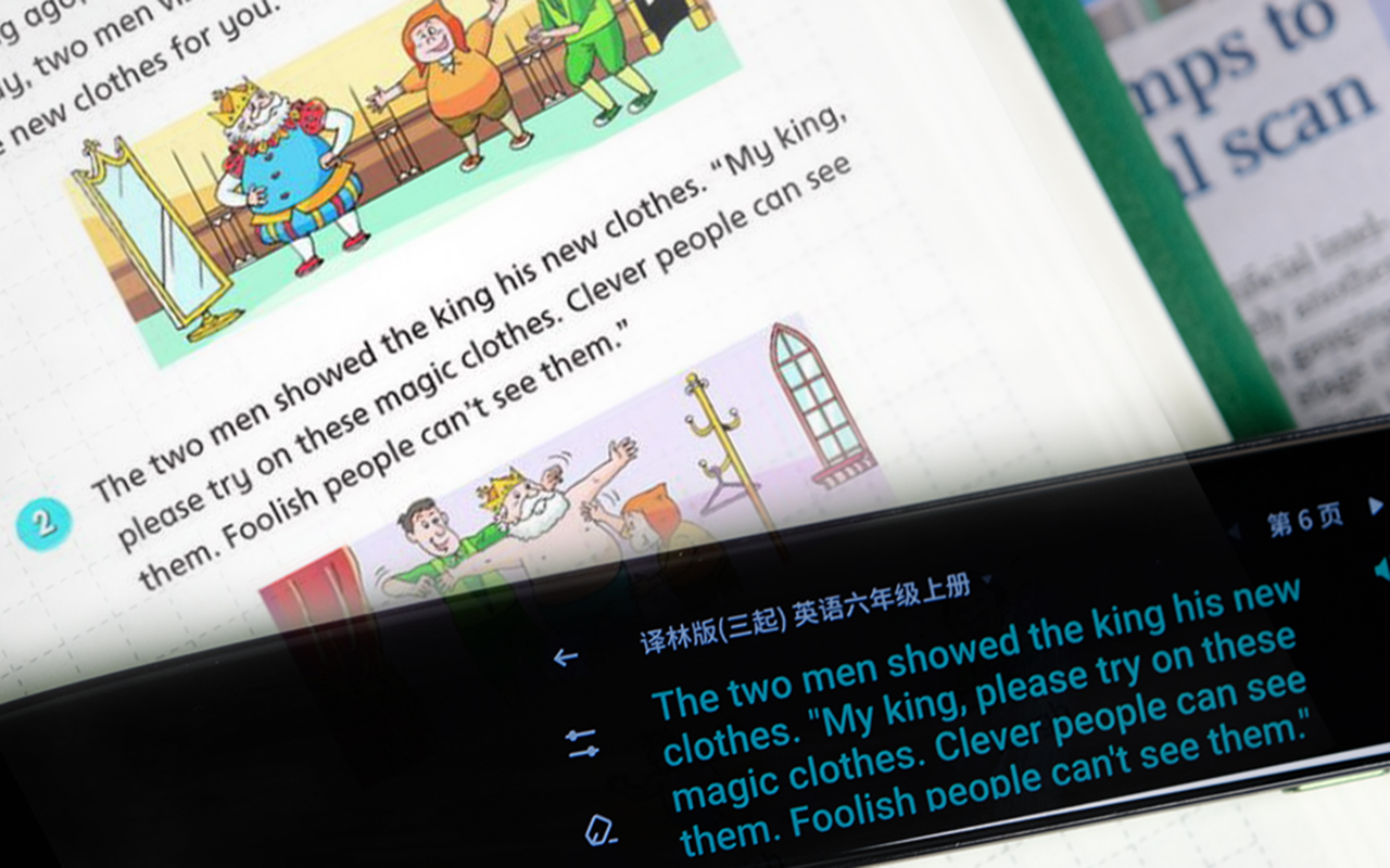 以英语六年级上册中"皇帝的新衣"为例,在课本扫读功能下学生仅需按照对应的页码进行内容的扫描,即可得到与书本中相同的内容,扫描之后会有中英文的语音播报。如果是很长的一段英文语句,学生无需对内容进行全部扫描,仅扫描其中的部分语句,系统则显示完整语句。该功能无论是提前预习还是复习课程,在学习上都能带来很大的帮助,可以说为孩子未来的学习打下了一个更为坚实的基础。