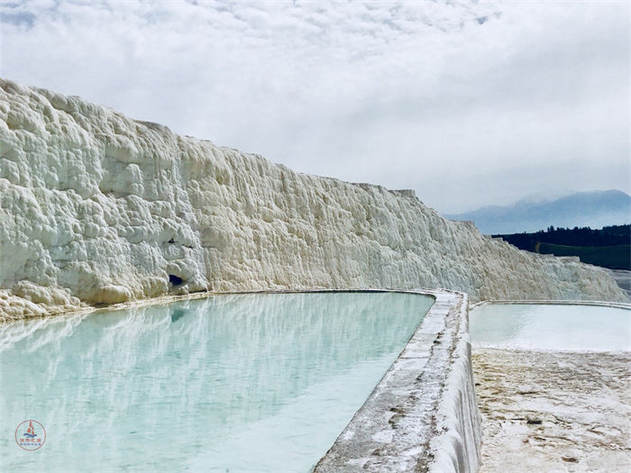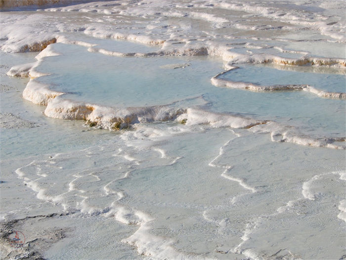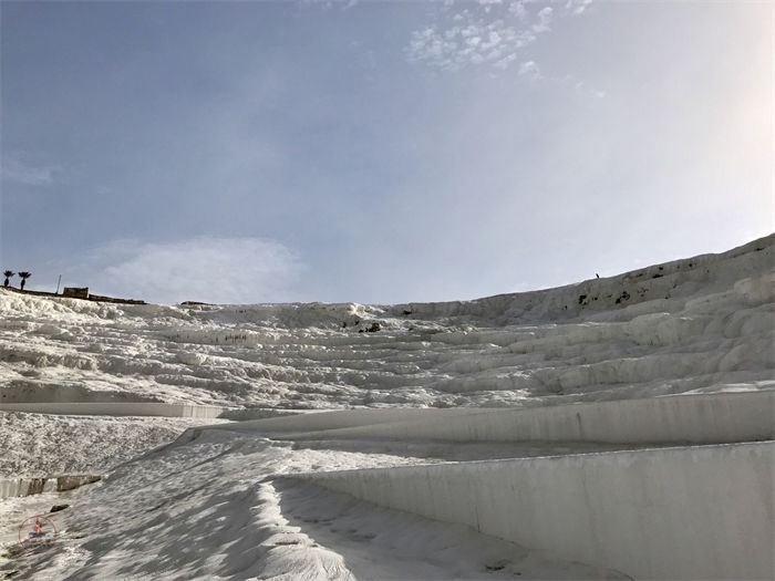 石灰华阶地是由于包含矿物质的泉水持续冲刷而形成的一种地质景观。在地表发育的沉积地貌向梯田一样顺着山坡层层下降,多呈淡黄色。地下水沿斜面流下时,矿物沉淀堆积成水坝状,这就是畦石。畦石继续堆积变成盘状,上面又生成新的畦石,最后形成台阶状,这就是石灰华阶地,一般都会蓄有水。冬天是土耳其旅游淡季,大部分的地方都没有水。这里的水量是人工控制的,夏天游客多的时候会给大部分池子灌上水,会美很多。