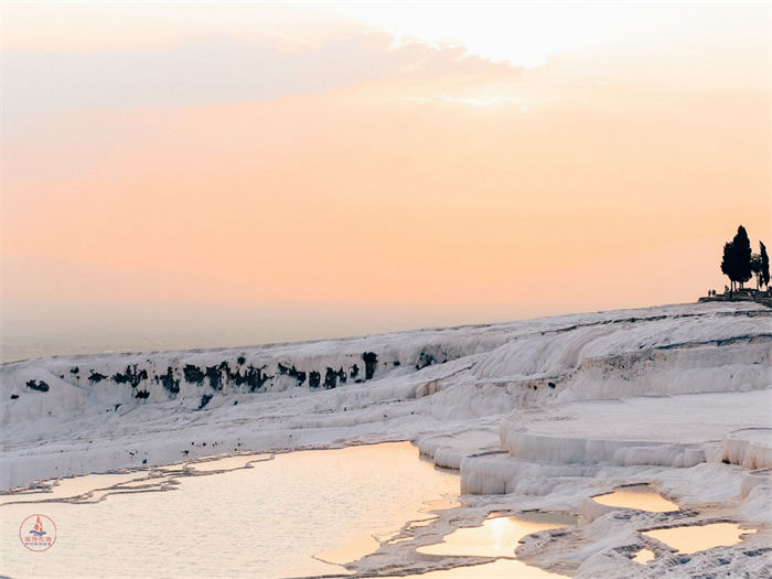 棉花堡在土耳其代尼兹利市的北部,是远近闻名的温泉度假胜地,这里不仅有上千年的天然温泉,更有钙化形成的好像棉花一样的山丘。石灰华梯田是棉花堡的主景点,含有石灰石成分的泉水在高地结晶后,形成层叠的镜面梯田。考虑到保护原因,游客不能穿鞋进入景区,清晨和傍晚最适合欣赏石灰华梯田,据说傍晚的夕阳在棉花堡的池子中会变化出夺目的色彩。